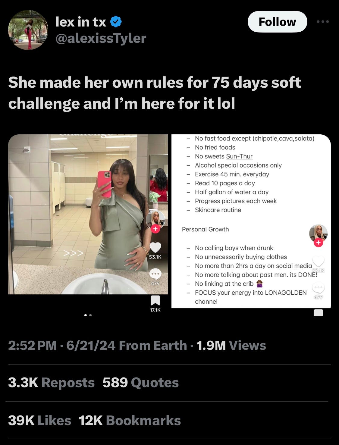 just prior to beginning my flexible twitter/x hiatus, I saw a viral ‘75 day soft glow up challenge’ tweet. the trend of a ‘soft glow up’ means focusing on mental health, personal wellness, and physical health. I think it’s great that people are collectively inspired to make positive transformation.