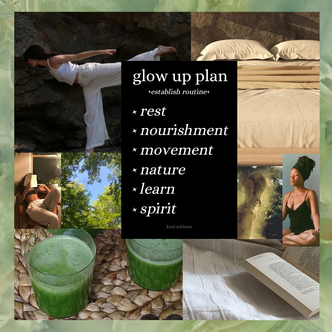 my summer glow up plan focuses most on creating a daily routine of healthier habits to improve my physical health and help me feel more centered spiritually. guiding my focus away from materialistic pursuits to a place of gratitude and (re)connection with Spirit. ♡